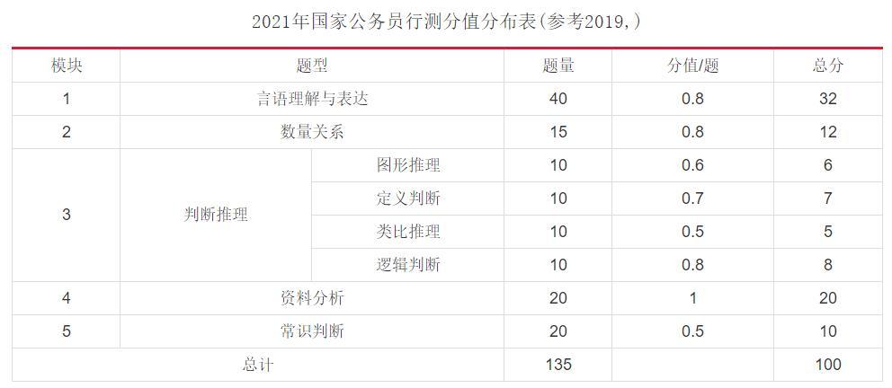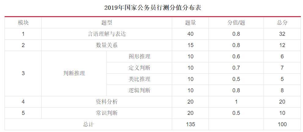 行测是国家公务员考试的一个部分,包括言语理解与表达、数量关系、判断推理、资料分析、常识判断五个部分,以下列出行测分布表,仅供大家参考,方便考生对此行测考试加以把握。该分值参考了历年国家考试考试题及地方的常见分值分布,旨在能够帮助考生了解试卷分值比重。在此提醒考生:行测分值会根据其题目数量及难度进行调整,该分值分布仅供参考,不作为评分标准。