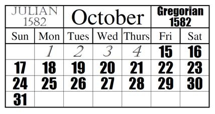 ►从儒略历到格里高利历的日期和星期变化。来源:Wiki