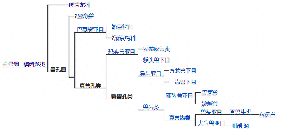 以前有个词汇叫“似哺乳爬行动物(下孔亚纲/单孔亚纲)”,但现在逐渐淘汰不用了,统一叫合弓纲(兽类),合弓纲包含了所有哺乳动物以及其祖先,“合弓”指“固定的颧弓”。颧弓是一个非常特别的部位,很多人会以为它表现的是颧骨侧前方的高度,其实是错误的。它实际上是面部眼眶下面的侧方。由于头骨的两侧各有一个下颞孔(太阳穴),从而确保了固定的合为一体的颧弓(只在一对颞颥孔下有一对颧弓,并没有像蜥形纲那样被两对颞颥孔分割为每边都有两块颧弓)。合弓纲的另一个重要特征则是四足皆在躯干之下而不是在侧面上。