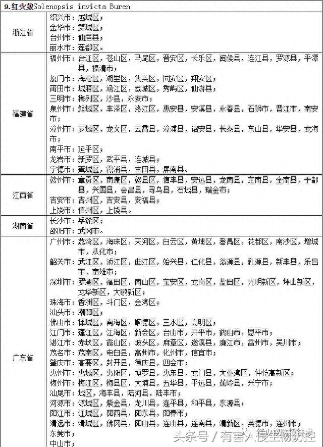 据农业农村部2018年发布的全国植物检疫性有害生物分布行政区名录:除香港、澳门、台湾外,红火蚁已扩大到其他11个省/区。