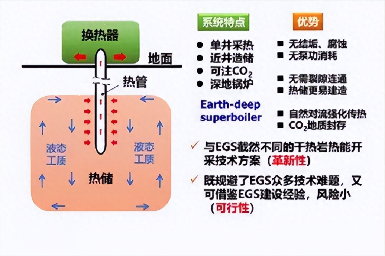 所以为了破解这一系列的问题,我国广州能源所创新性的提出了“重力热管”技术,通过只采取干热岩热能,不经过水分对热能的二次消耗而获取能量。