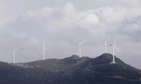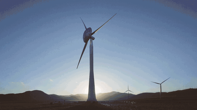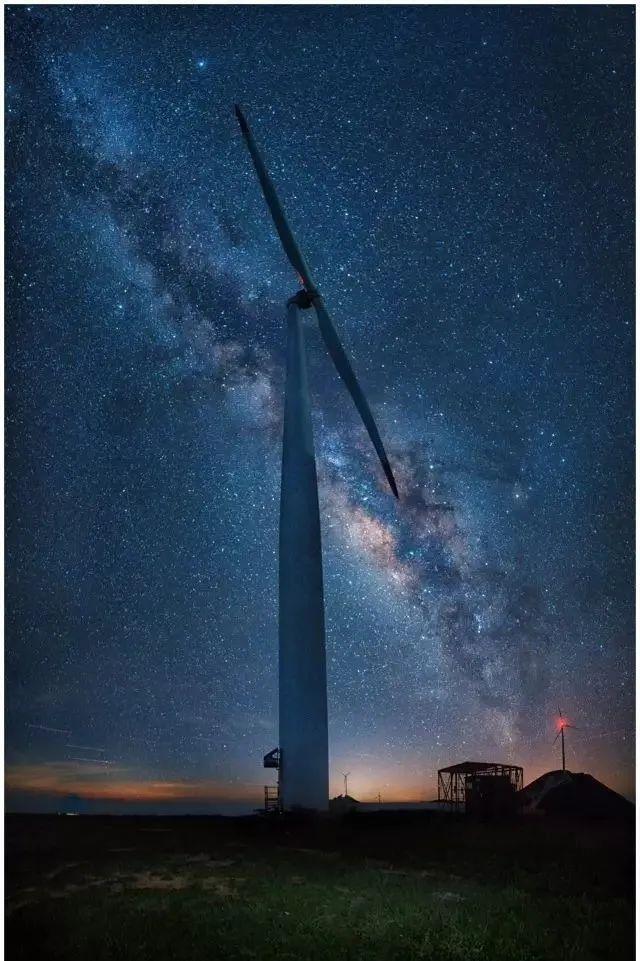 这里的山顶被夷为平地,并建立了大型风力发电机。站在下面,只见一根大钢柱巍然屹立,叶片至少有十几米长,像一个大风车在天地间缓缓转动。放眼望去,每隔几座小山就有一座风力发电机。它们站在牧场上不知疲倦地旋转,风雨无阻。