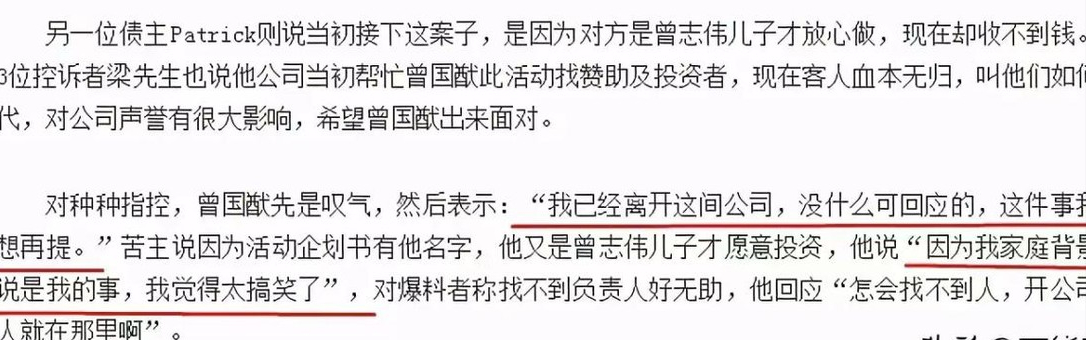 却不料最后不仅烂尾收场,还被指欠下了200万港币,可曾国猷却说那时他已经早已辞职。
