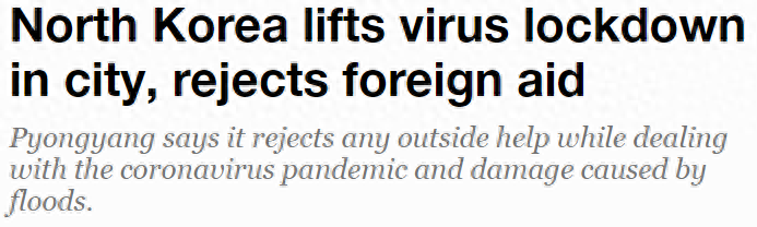 据国营朝鲜中央通讯社报道,金正恩在致朝鲜劳动党第七届中央委员会政治局的讲话中说:“在新冠疫情肆虐全球的情况下,我们决不允许任何的外部洪水赈灾援助,并且要严密封锁国境,开展严格的防疫工作。”