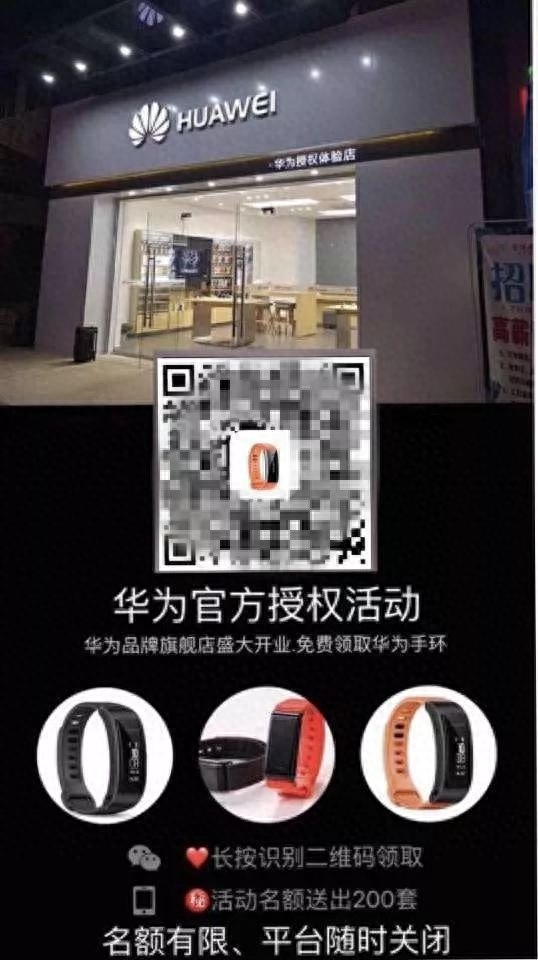 8月10日,玉林市民禤先生收到朋友发来的一张图片,图片里面写着:华为品牌旗舰店盛大开业,免费领取华为手环,识别二维码就能免费领取智能手环。刚开始禤先生不以为然,后来在朋友的催促下,再加上看到海报上写有官方授权字样,觉得信息来源应该可靠,就放心地扫描图片上的二维码。