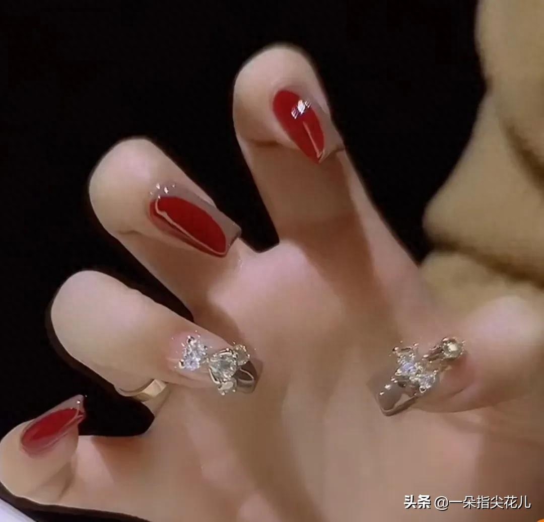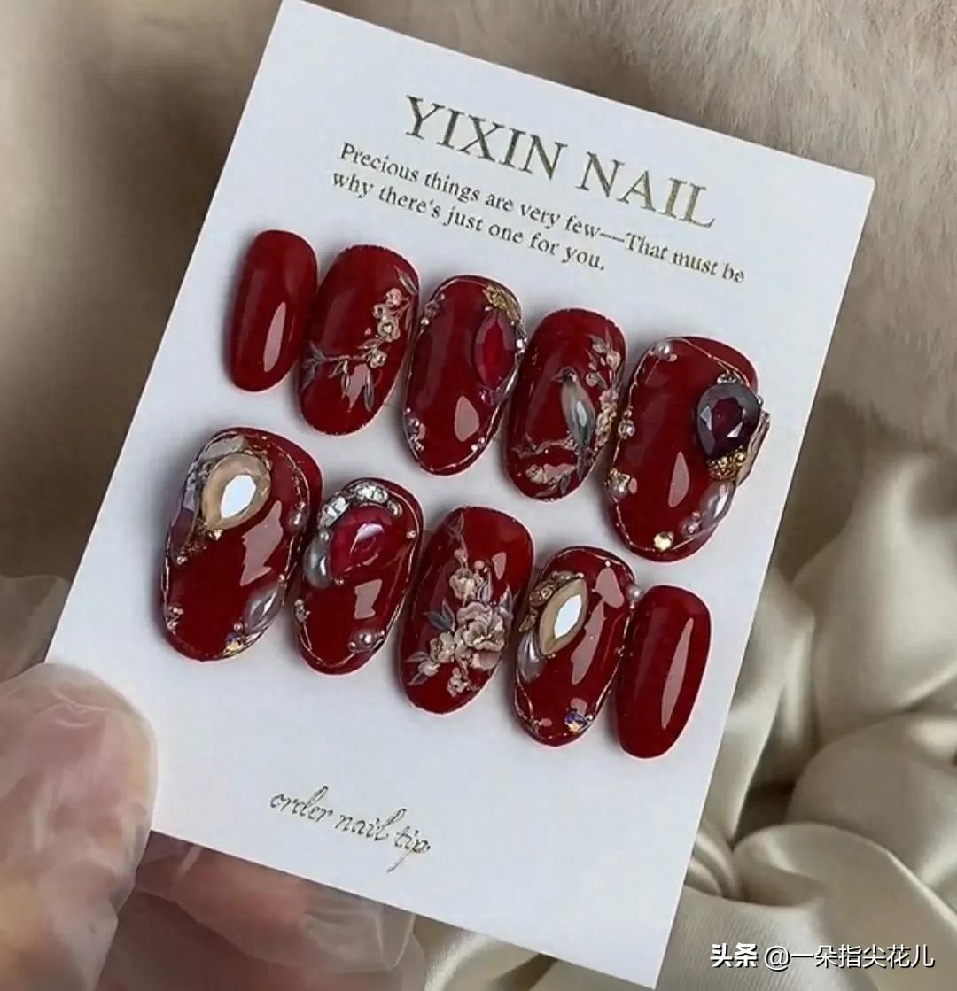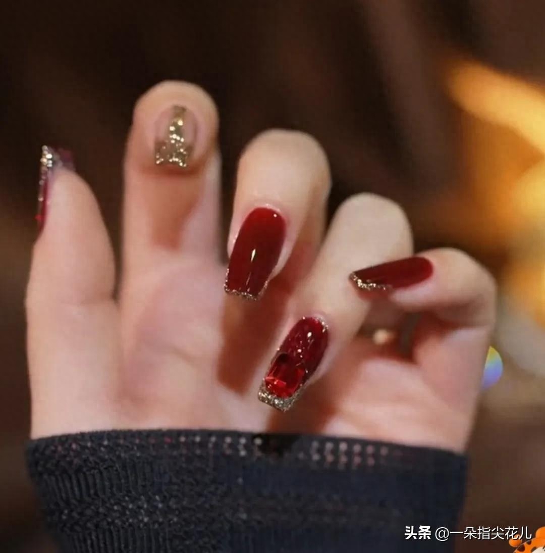 第六款:土黄色搭配大红色撞色,色系搭配高级,无名指大拇指法式加饰品。