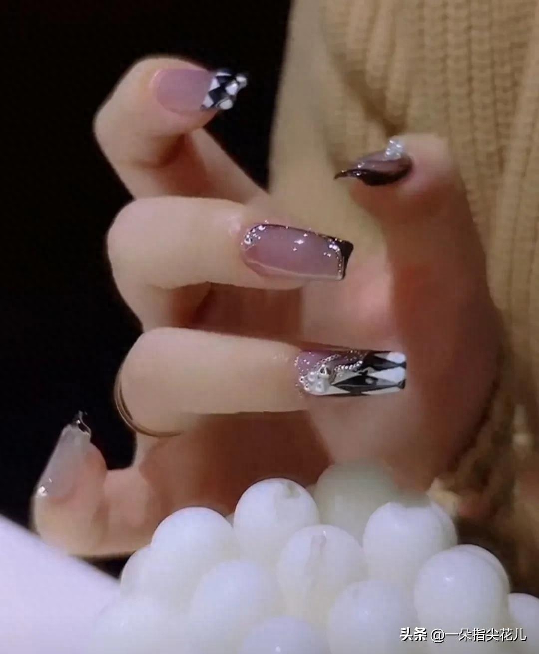第二款:果冻紫色系打底,画包办黑色边,银色铂金勾线。无名指食指画黑白菱形格。整体搭配饰品。