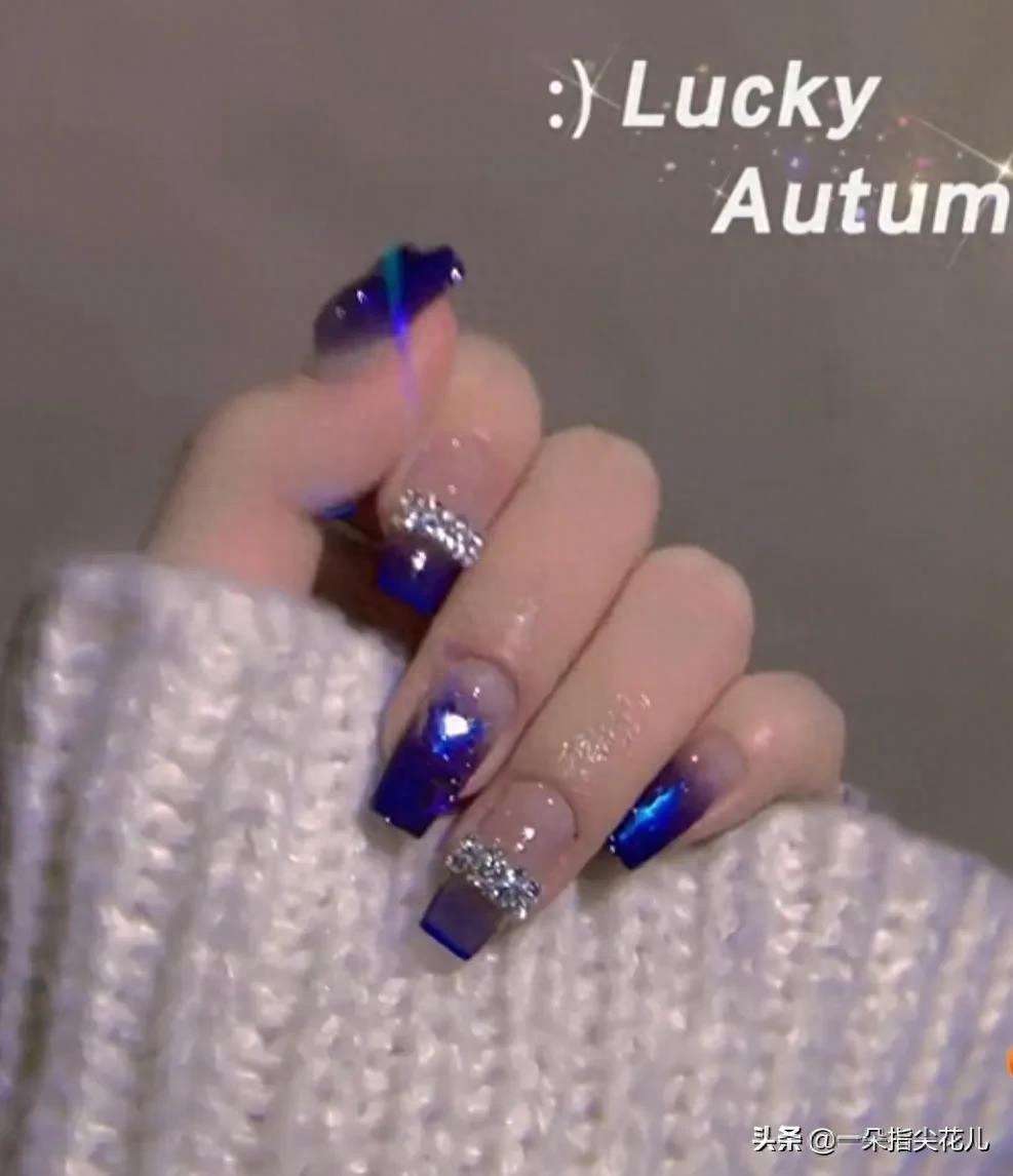 第三款:透色宝石蓝渐变,加实色宝石蓝T形法式,搭配蓝色极光钻和锆石链。