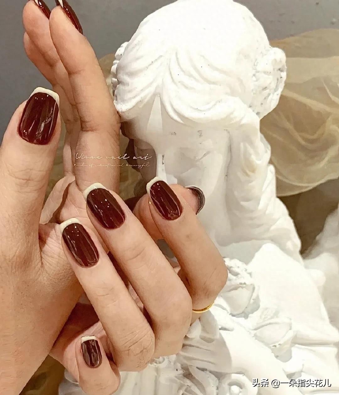 第十款:牛血红打底搭配烤漆白法式。时尚又高级。