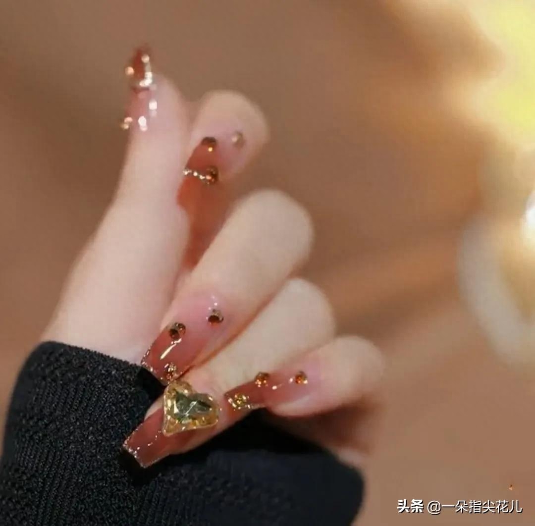 第七款:果冻奶橘色渐变,搭配金色铂金勾边,点缀超小立体钻球和香槟色尖底歪心。