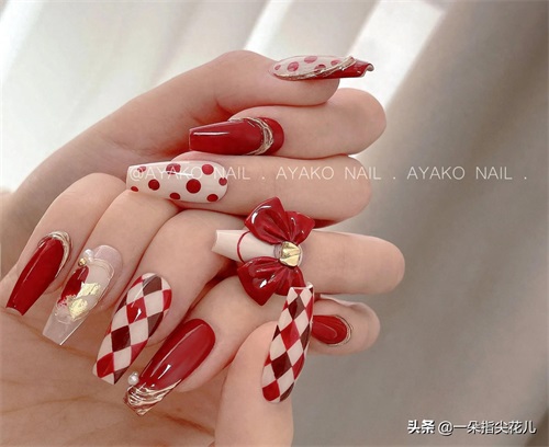 第八款:大红色搭配波点、菱形格,金属魔镜粉和红色蝴蝶结。