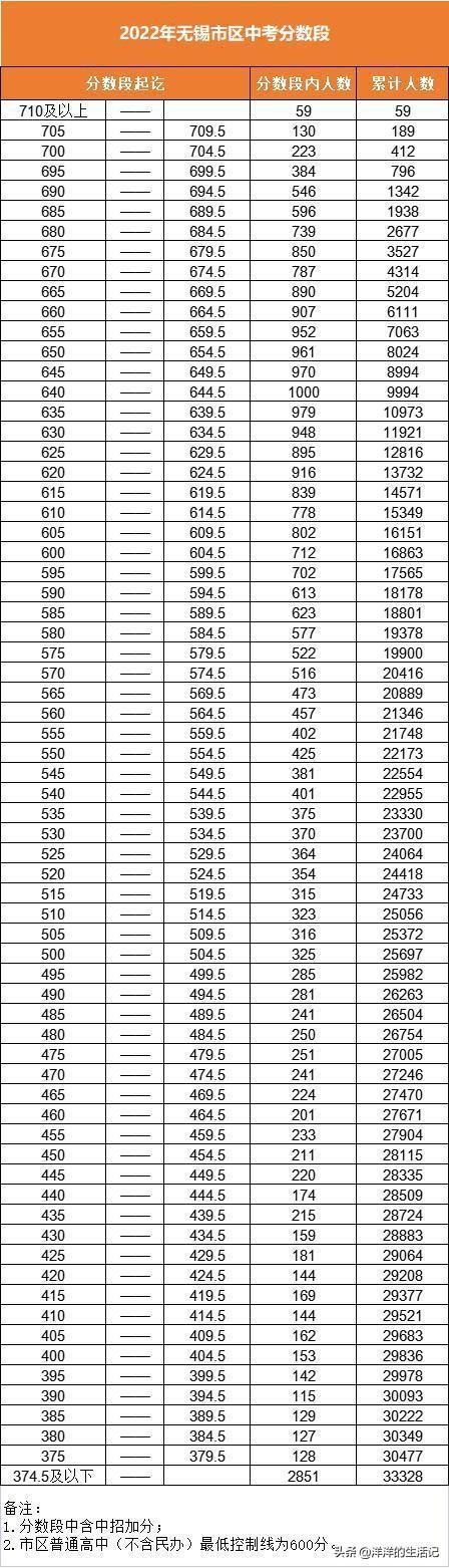根据已经公布的中考成绩,今年无锡710分以上人数达到59人;今年无锡700分以上人数达到412人;650分以上人数达到8024人;625分以上人数达到12816人;600分以上人数达到16863人(请注意这些分数段,后面要考的)。