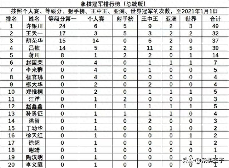 中国象棋史上最全冠军榜单发布:许银川高居第一,王天一暂列第四