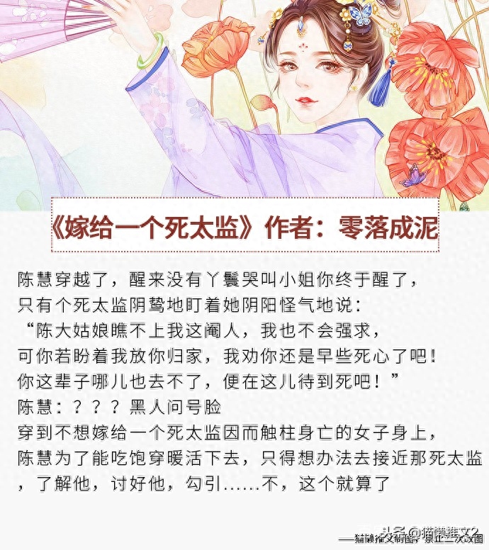 《嫁给一个死太监》作者:零落成泥简评:看过最好看的太监文!男主特别让人心疼,六岁进宫,想要活下去就只能走大多人走过的路。他很坏很毒很阴险,可也还渴望读书,也向往一份真正的感情,他虽然有权但不祸害民生百姓,虽然贪但是能尽自己所能救济雪灾,虽然嘴上说着要折磨女主千百遍但一次都下不去手。就是个迷人的傲娇鬼,爱女主爱到骨子里了,误会女主和人怀孕小产,以为自己被戴了绿帽都要气死了,冷静下来还选择原谅女主并且送孩子过去给女主挑,就怕孩子没了女主伤心。女主性格也很棒,喜欢就是喜欢了,知道自己喜欢男主后就各种撩各种确定对方对自己的感情。