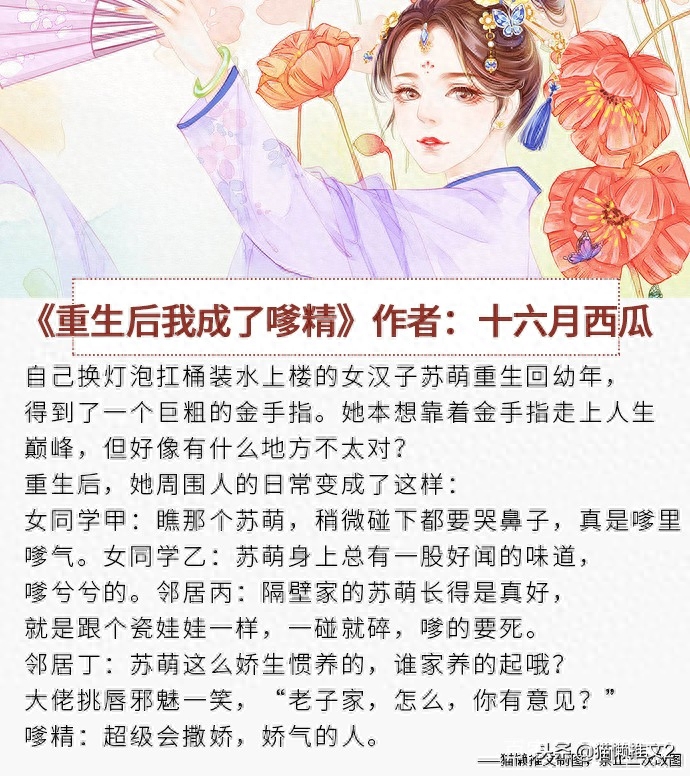 《重生后我成了嗲精》作者:十六月西瓜简评:女汉子重生变撒娇小公主和风流倜傥深情忠犬男.上辈子被妹妹欺骗的苦哈哈女主,重生后得到空间,实现了不再懦弱隐忍的愿望,获得了无敌美貌和一张嘴就发嗲的金手指(自动翻译那种),当然还有极品忠犬男主。