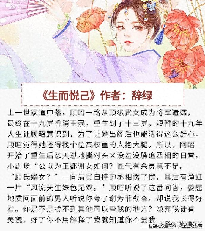 《生而悦己》作者:辞绿简评:女主怼天怼地撕对头顶级贵女没羞没臊追丞相的日常。最甜可爱女主和闷骚腹黑男主。女主上一世家道中落,十九岁就死了。重生一世变回了十三岁的时候,因为知道上一世发生的事情,所以决定找个位高权重的人抱大腿,继而盯上了我们丞相男主,女主特别会撒娇。