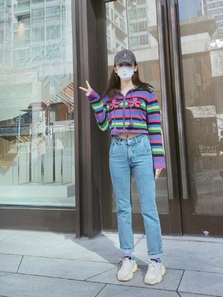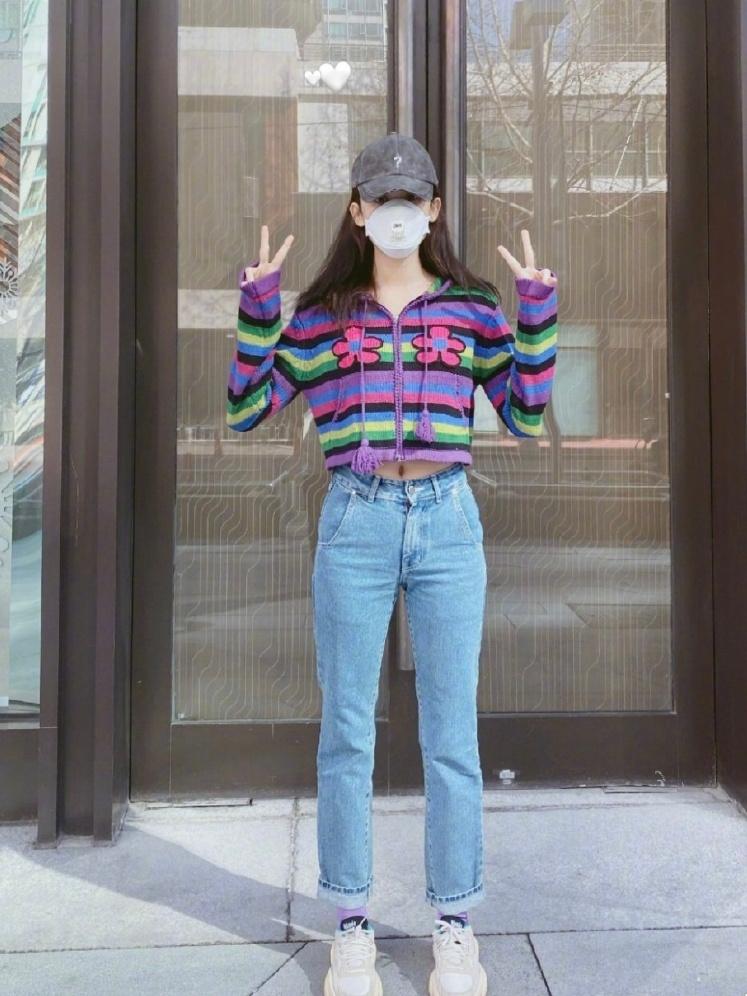 一般来说这种基础版型的小开衫以纯色为主,娜扎这次选择了一款彩色的针织款式,露腰的长度搭配上高腰牛仔裤,视觉上修饰了她整体的身材比例,显得腿又长又细。彩色系的配色也很衬肤色,就算在自然的灯光下,娜扎的皮肤也是白到发光。直筒版型的牛仔裤也很修饰腿型,显得腿又长又直,