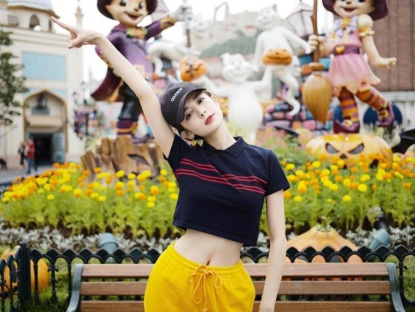 运动风的短袖,藏青色搭配上亮眼的柠檬黄色也是十分衬肤色的配色。搭配上一顶深色系的棒球帽,可以说是出游必备了。不得不说娜扎不仅五官精致,身材更是不输很多女idol!