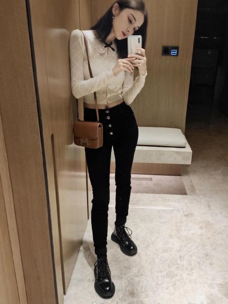 露腰的上衣也可以是甜甜的少女风,修身的版型非常修饰娜扎的身形,骨感却不失凹凸感。露腰的款式搭配上黑色高腰裤,非常显身材。这个视角看娜扎的腿长也是逆天了,再搭配上一双黑色的马丁靴,又酷又帅,上衣甜美的荷叶边又给整体造型增添了甜甜的少女感!