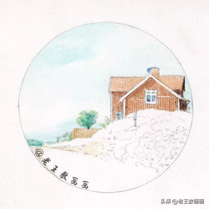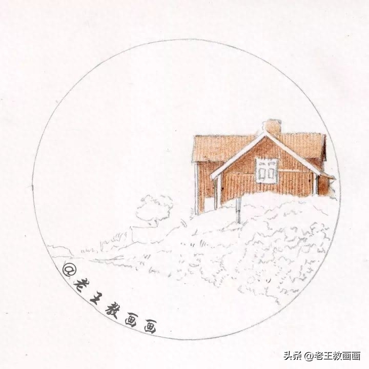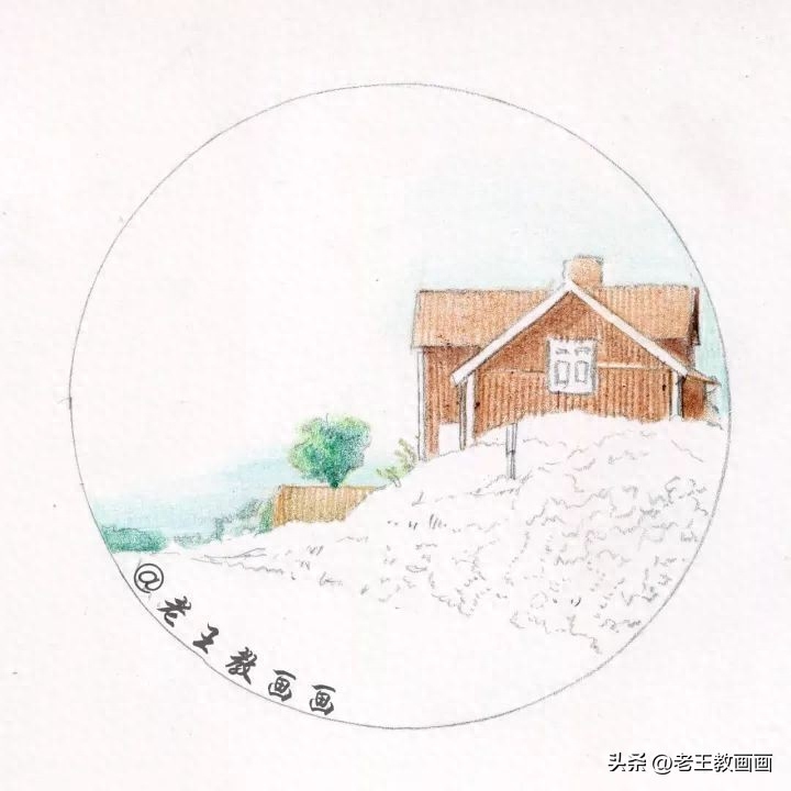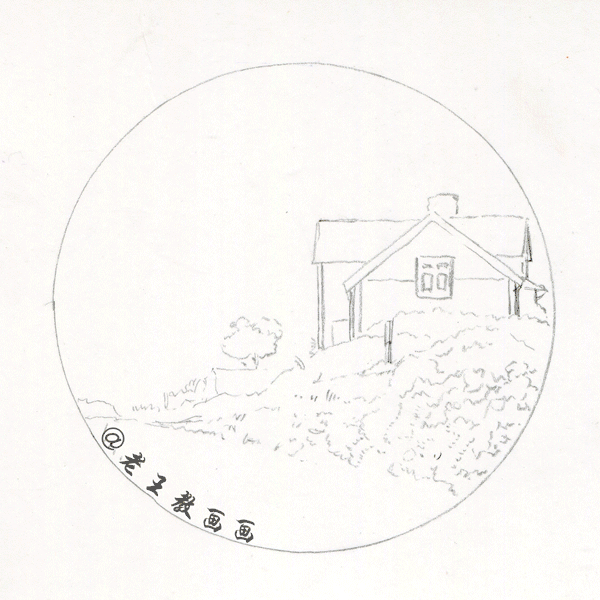 >>>【第1步】:先用圆规画个圆,根据原图,用2B铅笔房子和草地的形体区域,房子、草地和天空成两个半圆的比例(P1↓)