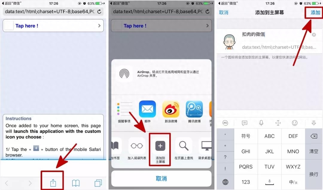 3、 点击【Open Popup】后,再点击浏览器下方中间的按钮,继续点击【添加到主屏幕】,最后点击【添加】即可。