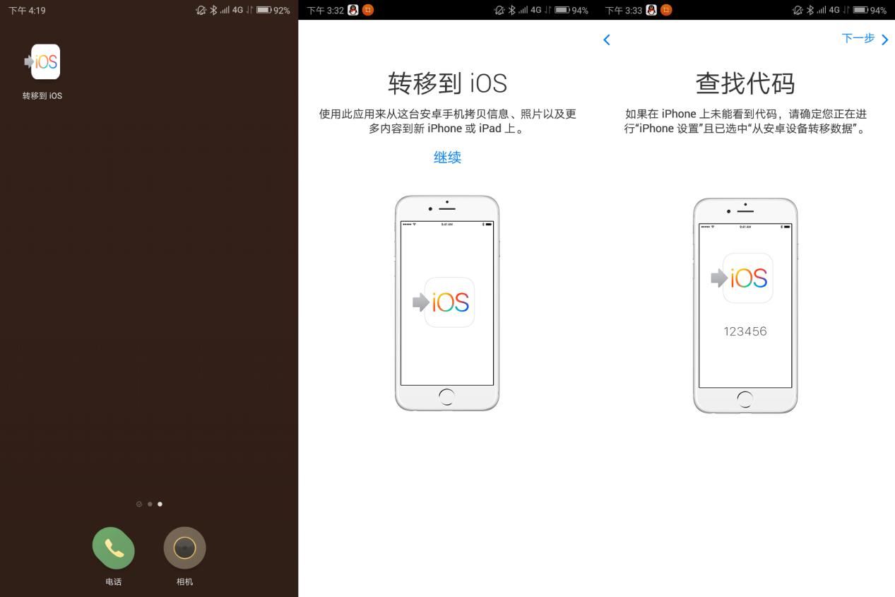打开「转移到iOS」app,依次点「继续」、「同意」,会提示让你输入 iPhone 上面的一串代码。这时打开接受数据的新iPhone,完成激活,在应用与数据上面选择「从安卓设备转移数据」,按照提示依次点击,便会出现需要的代码,把这串代码输入到安卓手机,选择你要传输的数据,剩下的就是等待传输完成了。如果iPhone是已经激活过的设备,那就打开设置–通用–还原–抹掉所有内容和设置,这样iPhone就会回到未激活状态了。