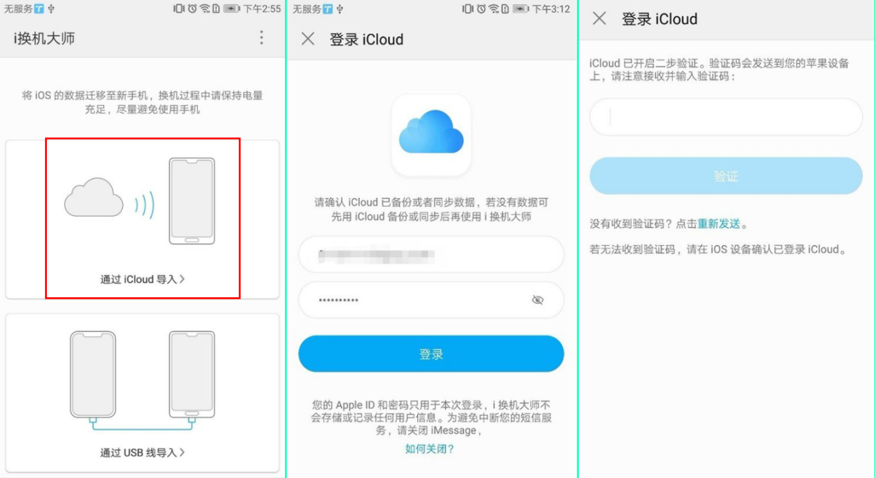 然后打开华为的「i换机大师」或小米的「小米换机」,登陆自己的iCloud账号,选择需要下载的数据类型,点击开始导入。迁移数据过程中要保持网络的通畅,建议连接速度较快的WIFI网络,再进行数据迁移操作。