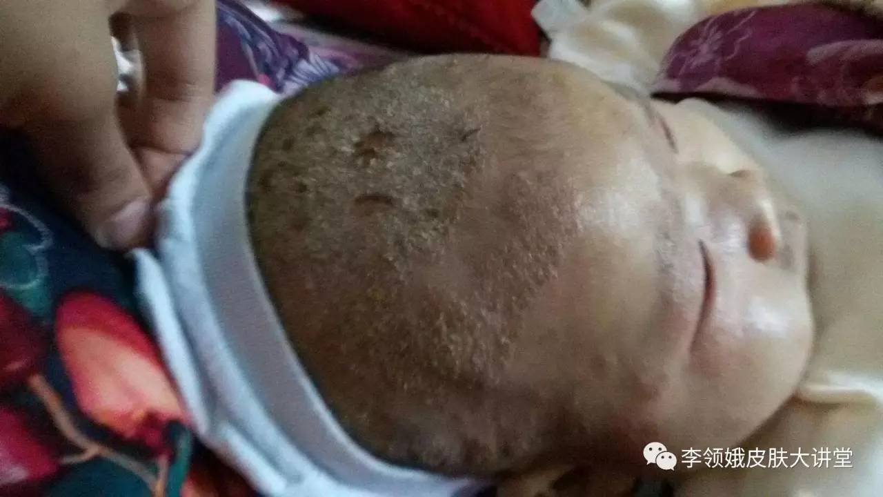 患儿前额、颊部和眉间皮肤潮红,被覆黄色油腻性鳞屑,头顶可有较厚的黄色液痂。严重时,颏下、后颈、腋及腹股沟可有擦烂、潮红及渗出。