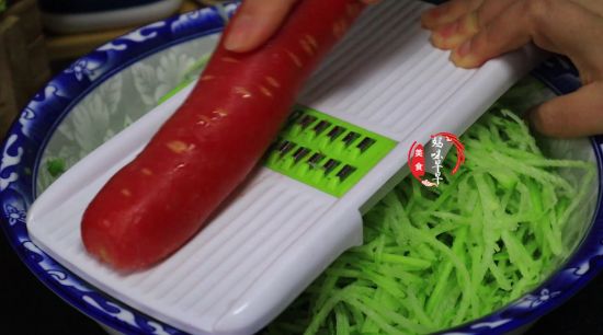 第一步、首先准备一个绿萝卜,洗净后去掉两头,然后插成细丝,然后再准备一根胡萝卜也插成细丝。