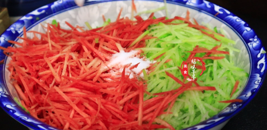 第二步、接着加入2勺盐,把萝卜丝抓拌均匀,腌制10分钟,沙出多余的水分。