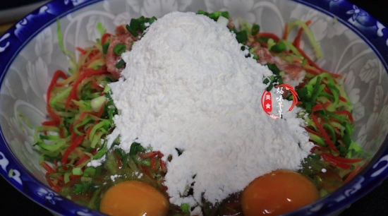 第五步、然后将萝卜丝抖散在盆子里,加入5块钱的肉沫,葱花姜末,一勺食盐、适量胡椒粉,然后打入2个鸡蛋,在倒入适量的酥肉粉,这个是酥脆的关键。