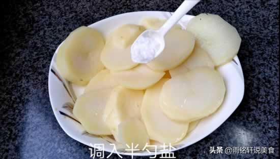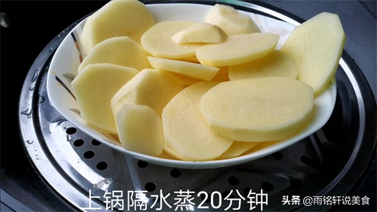 第一步:土豆洗净削去皮再切薄片,切好放盘子里上锅隔水蒸20分钟左右,蒸至筷子能轻松插进去即可。