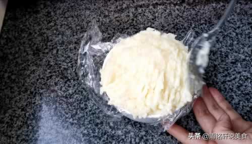 第四步:准备一个碗,碗里铺上一层保鲜膜,然后把土豆泥倒入碗里,用叉子把它压实整平。