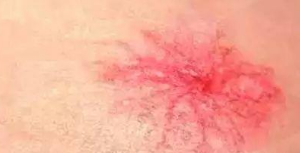 蜘蛛痣又叫肝星,为体内雌激素水平升高使末梢细小动脉血管扩张充血所致。形如蛛网或蜘蛛足样向周围散布,色鲜红,用大头针帽或细棉签按压中心部位,其向四周扩散的伪足样血管网随即消失。