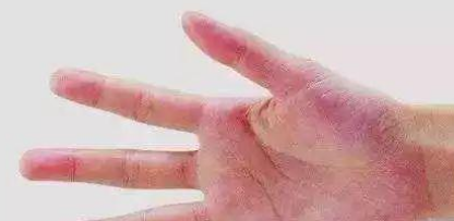 肝掌为双侧手掌中大、小鱼际及手指末端明显充血变红,色泽鲜艳如朱砂或胭脂者。掌心色泽相对较浅,与之形成较大的反差,按压或用力后暂时褪色变白。