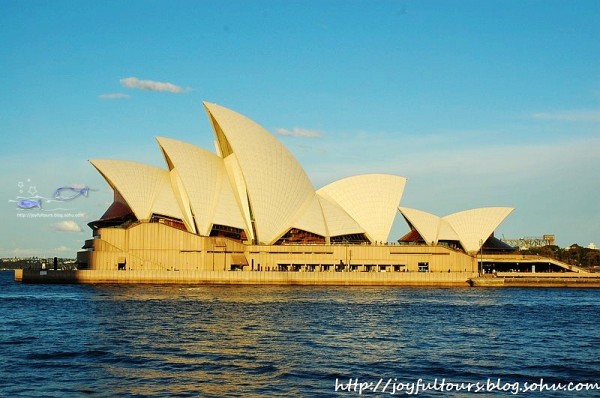 夕阳的金色光辉为歌剧院镀上一层神秘的色彩。最右边的那部分这个角度看去像翩翩起舞的蝴蝶
