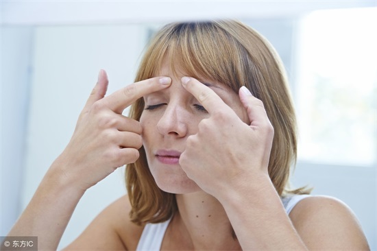 1、按摩睛明:轻闭双眼,用手指按压晴明穴,中指扶眉,食指扶眼眶。先用指压法轻按2分钟,再用无名指轻揉按摩外眼角和太阳穴处。
