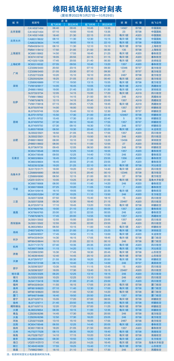 绵阳所有始发航班