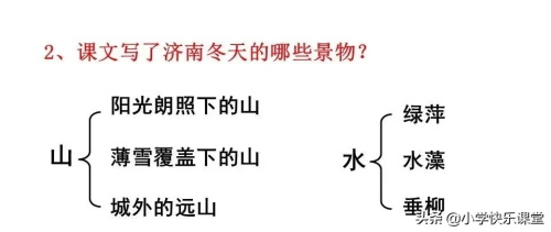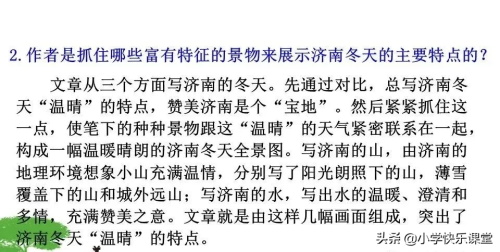 一、济南的冬天有着“温晴”的特点。作者在文中主要描写了济南的山和水,借三幅画来描写济南的冬景。第一幅画描绘了阳光下济南的全景。第二幅画描绘了秀美的雪景。第三幅画描绘了澄清温暖的河水。作者以这样三幅美景,描绘出了济南特有的动人的冬景。