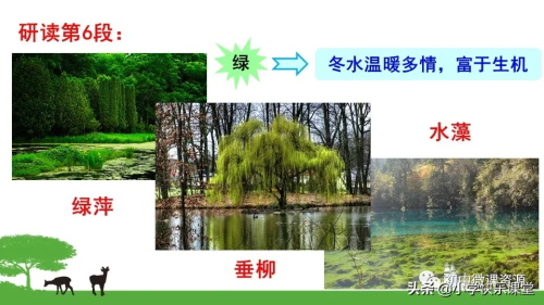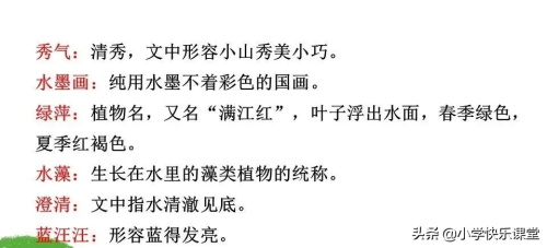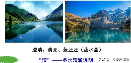 ③清亮:作者通过写长枝的垂柳“还要在水里照个影儿”以及澄清的水同蓝汪汪的天浑然一体,如同一块空灵的蓝水晶来表现水的清亮。