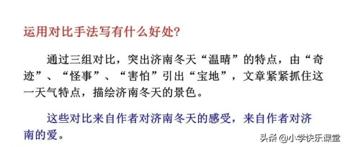 比如:济南冬天美,美在温晴的天气,没有呼呼的风声,没有浓重惨淡的灰雾,没有毒辣辣的烈日,是响晴的宝地。
