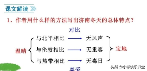 (2)写“温晴”是从自身感受的角度来写的,通过和北平冬天多风、伦敦多雾、热带日光的毒和响亮作对比,写济南冬天无风声、无重雾、无毒日的“奇迹”“怪事”,突出它独有的“温晴”特点,赞赏它是个“宝地”。画面中“寒”与“暖”、“暗”与“明”、“热”与“温”的色调烘托出济南冬令阳光和煦、天朗地秀的总体形象。在结构上是全文的总体,为下文具体描述作铺垫。
