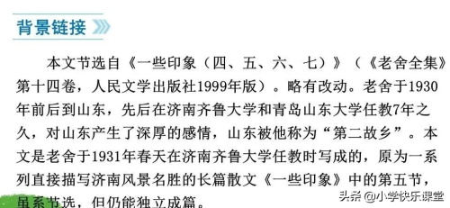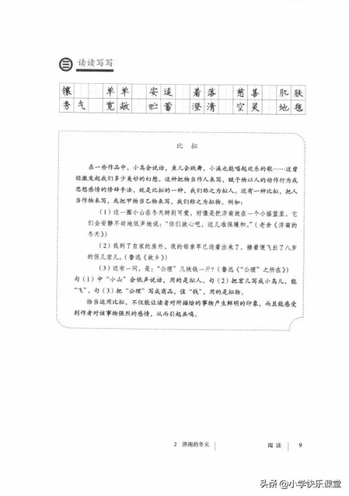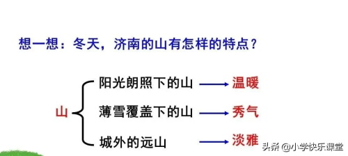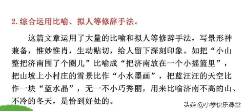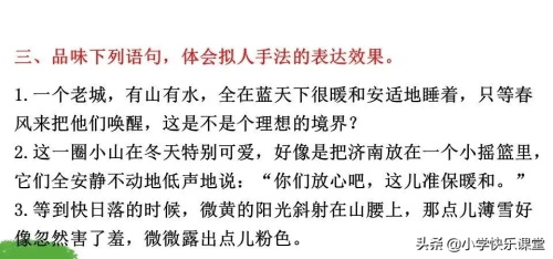 2、本文语言朴实清新,情辞恳切,运用比喻、拟人手法,描绘了阳光朗照下的小山、薄雪覆盖下的小山、城外素淡雅致的远山、澄清透绿的水等画图,表现济南冬天“温晴”的特点。想一想:作者为什么能用如此精妙的语言描绘出如此精美的画面?你获得哪些写作启示?