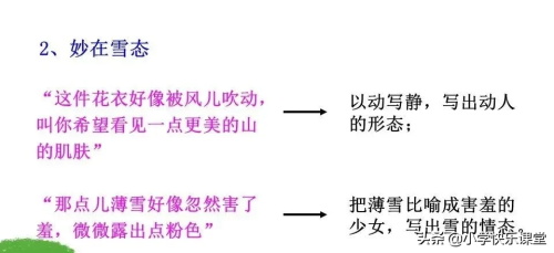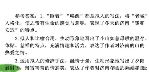 △“雯山上的矮松越发地青黑,树尖上顶着一点儿白花,好像日本看护妇。……山坡上,有的地方雪厚点,有的地方草色还露着;这样,一道儿白,一道儿暗黄,给山们穿上一件带水纹的花衣;看着看着,这件花衣好像被风儿吹动,叫你希望看见一点更美的山的肌肤。” 综合运用比喻、拟人的修辞手法,描写小雪后山的美丽、动人之景。尤其是“看护妇”的比喻,“山的肌肤”的拟人,生动形象地写出了披雪的矮松和飘雪的山体那种美丽的风姿和那飘逸而令人向往的神韵。△“山坡上卧着些小村庄,小村庄的房顶上卧着点雪。” “卧”字来写村庄,写雪,写它们的状况、情态,仿佛是写活物,活灵活现。 △“等到已然日落的时候,微黄的阳光斜射在山腰上,那点薄雪好像忽然害了羞,微微露出点粉色。”把夕阳斜照下粉色的薄雪,比拟为害羞的少女。“害了羞”将雪赋予了人的情感,“露出点粉色’’写出了济南冬天温晴的特点。“微微”词用得贴切,因是“温晴”而不是“热带”之热。 △“天儿越晴,水藻越绿,就凭这些绿的精神,水也不忍得冻上,况且那些长枝的垂柳还要在水里照个影儿呢!” 把水藻、水和垂柳都人格化了。“不忍得”将水人格化,使水富有了灵气,表现了济南冬天的春意盎然及其孕育着的朦胧眷恋。