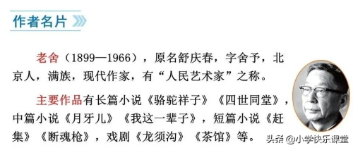 老舍(1899-1966),原名舒庆春,字舍予,北京人,满族,作家。曾被北京市人民政府授予“人民艺术家”的光荣称号。他的作品很多,代表作有小说《骆驼祥子》《四世同堂》,戏剧《茶馆》《龙须沟》等。