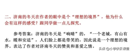 二、济南的冬天有阳光,小山整把济南围了个圈儿,为济南挡住了冬天的寒风,保存了温暖,济南变得暖和安适,所以济南的冬天是个“理想的境界”。济南的冬天本身的“温晴”的特点,是作者有如此感受的一个原因,而作者对济南的喜爱,更是他产生这种感受的因素。