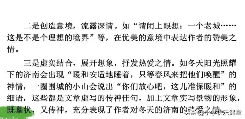 老舍先生是语言大师,他笔下的济南冬天温暖如春、秀丽如画、清亮如水晶。作者为了让我们对济南“温晴”的冬天有个具体可感的印象,在描写景物时,发挥想象,用了不少满含温情的优美而生动形象的语言。