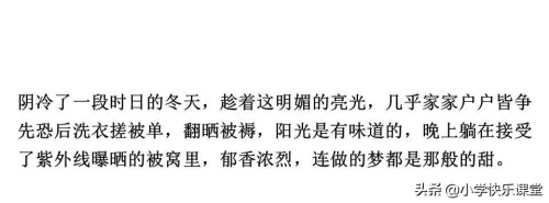 五、示例:冬天的太阳,对家乡上海格外偏爱,照得人心头热烘烘的,照开了人们脸上的笑容。上班族们哼着轻快的歌,兴奋地去工作;老人们乐呵呵地坐在院子里或唠叨家常,或收拾老家当……生活在上海,冬天粉装玉砌的白雪世界是无缘相见了。偶尔,从天空飘落的零星雪花,时而夹杂着丝丝细雨,为这座城市增添一份妖娆。这足以使上海人高兴好一阵子了,有时人们无法分清那纷飞落下的是雪还是雨,但感受到的不是寒冷,而是一份特别的美丽和一种小小的雀跃。可爱的上海人,总想假装憋气,对外地人抱怨:“这地儿真没劲,老不下雪。”却又总也藏不住心中的快乐与骄傲。那黄浦江水不结冰,还吸引了成群远道而来的游客,参观黄浦江畔——蓝蓝的天、高高的楼、潺潺的水,构成了一幅美妙绝伦的图画。登上东方明珠顶层俯视上海,一派美景尽收眼底。