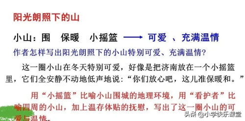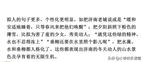 △“这一圈小山在冬天特别可爱,好像是把济南放在一个小摇篮里。” 把济南比作“小摇篮”, 比喻小山围城的地理环境,生动形象地写出济南的可爱。 △“一个老城有山有水,全在天底下晒着阳光,暖和安适地睡着,只等春风来把它们唤醒”。 用一“晒”、-“睡”、-“醒”,一连串相关的拟人手法,将老城人格化,使之带有生命的感觉与意味,表现了济南“暖和安适”的特点。