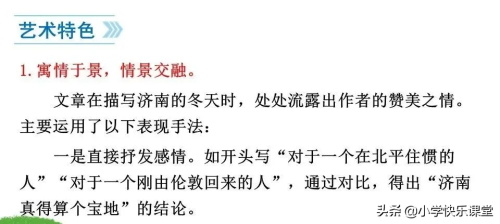 文章绘山景,描水色,寓情于景,既表现济南冬天山水之美,又寄寓对祖国河山真挚的爱。